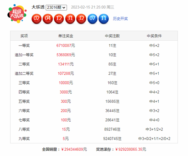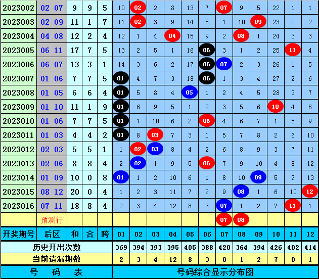 大乐透第2023016期开奖,前区:02、04、12、31、32;后区:07、11。其中前区012路比为1:2:2,后区开出1路号码和2路号码。
